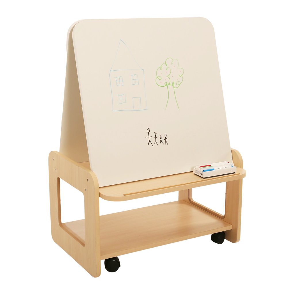 A double sided easel designed to allow toddlers to work simultaneosly with storage.