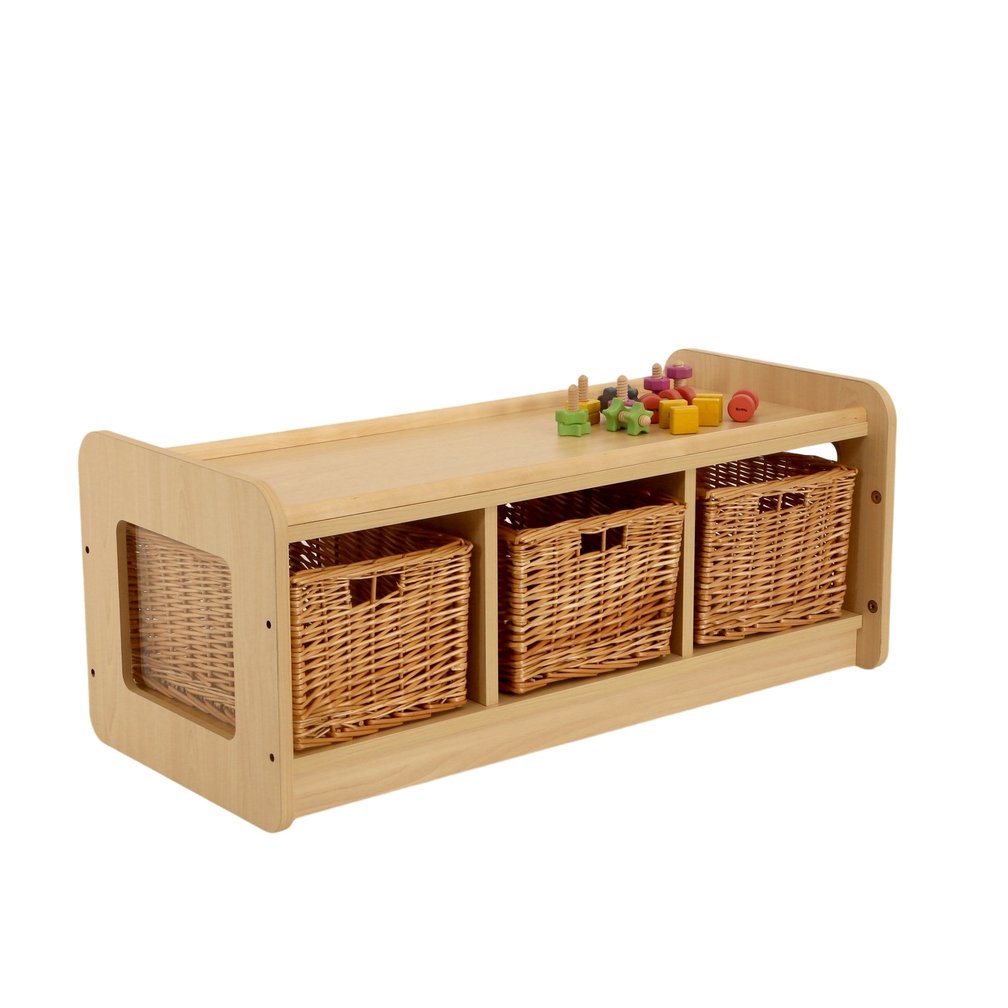 Low level storage unit designed for toddlers with easy access deep baskets.