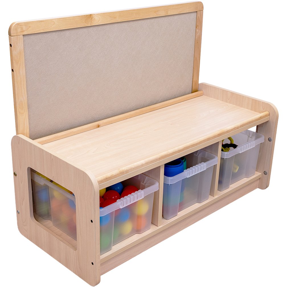 Low level storage unit designed for toddlers with easy access. With a Felt/Drywipe display add-on and 3 Deep Trays.