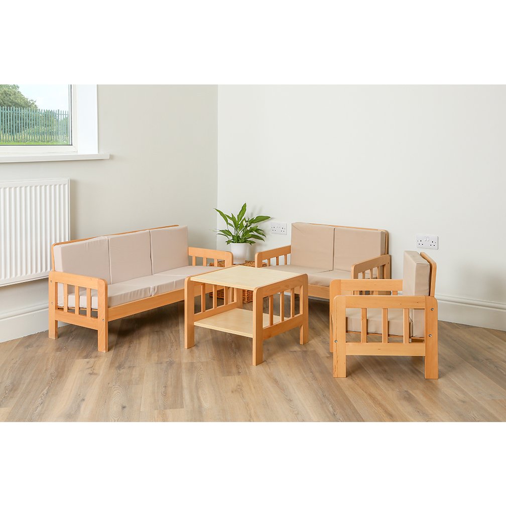 Ideal for any school reading corner or home play area. Using finest quality hard-wood throughout the frames, these items have a natural polish finish and are robustly jointed for hard wear. The cushions have flame retardant covers which may be removed for washing at up to 60degrees. Designed with children aged 5-9 in mind.