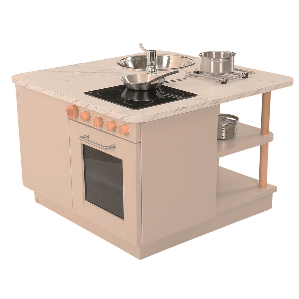 Create an inspiring home-corner or role-play space with this beautifully designed Toddler Kitchen Island, featuring a modern, neutral aesthetic perfect for early years environments. This all-in-one unit includes a realistic pretend hob, built-in oven, stainless-steel sink, and open storage shelves, offering children endless opportunities for imaginative cooking and social play.