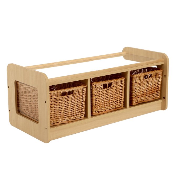 The Mirror Table Store is a compact storage solution designed for toddlers. This unit includes a safety mirror top for interactive sensory play and 3 deep storage baskets.