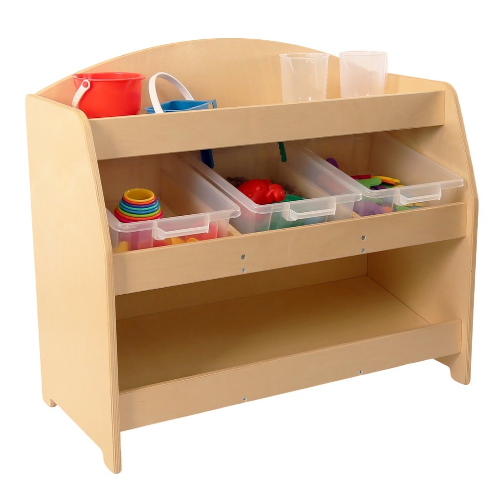 This versatile Sand and Water Storage unit with angles shelves to allow water to drip off the toys and holes in the top shelf for storing your utensils.